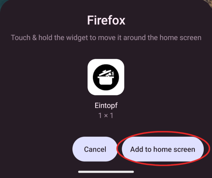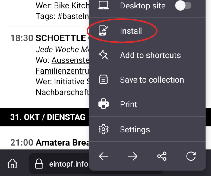 Falls der Install Button nicht angezeigt wird, folgt dieser Anleitung um die App auf eurem mobilen Gerät zu installieren. Im Beispiel wird Firefox verwendet, mit anderen Browsern funktioniert es ähnlich.